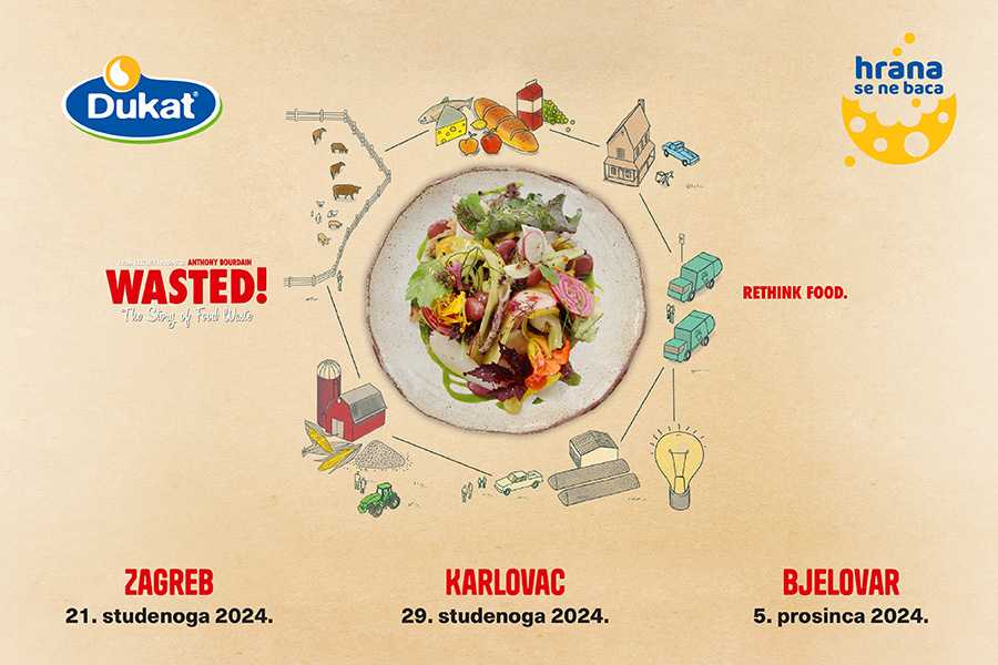 U vrijeme blagdana, kada bacanje hrane raste čak 25 posto u odnosu na ostatak godine, Dukat poziva građane na besplatne projekcije inspirativnog dokumentarca „Wasted! The Story of Food Waste“, slavnog chefa i pisca Anthonyja Bourdaina. Ovaj izvrstan dokumentarac razotkriva globalne razmjere problema bacanja hrane te prikazuje koliko resursa odlazi u otpad zbog neiskorištene hrane, s negativnim posljedicama za okoliš, ekonomiju i društvo.